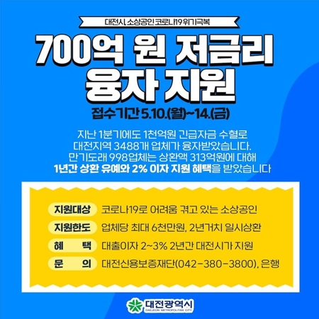 ![]() 접수기간 5. 10 (월) ~ 14 (금) 지난 1분기에도 1천억원 긴급자금 수혈로 대전지역 3488개 업체가 융자받았습니다. 만기도래 998업체는 상환액 313억원에 대해 1년간 상환 유예와 2% 이자 지원 혜택을 받았습니다. 지원대상 : 코로나19로 어려움 겪고 있는 소상공인 지원한도 : 업체당 최대 6천만원, 2년거치 일시상환 혜택 : 대출이자 2~3% 2년간 대전시가 지원 문의 : 대전신용보증재단 042-380-3800, 은행 출처 : 대전광역시 공식 인스타그램 When anger rises, think of the consequences. When anger rises, think of the consequences. |