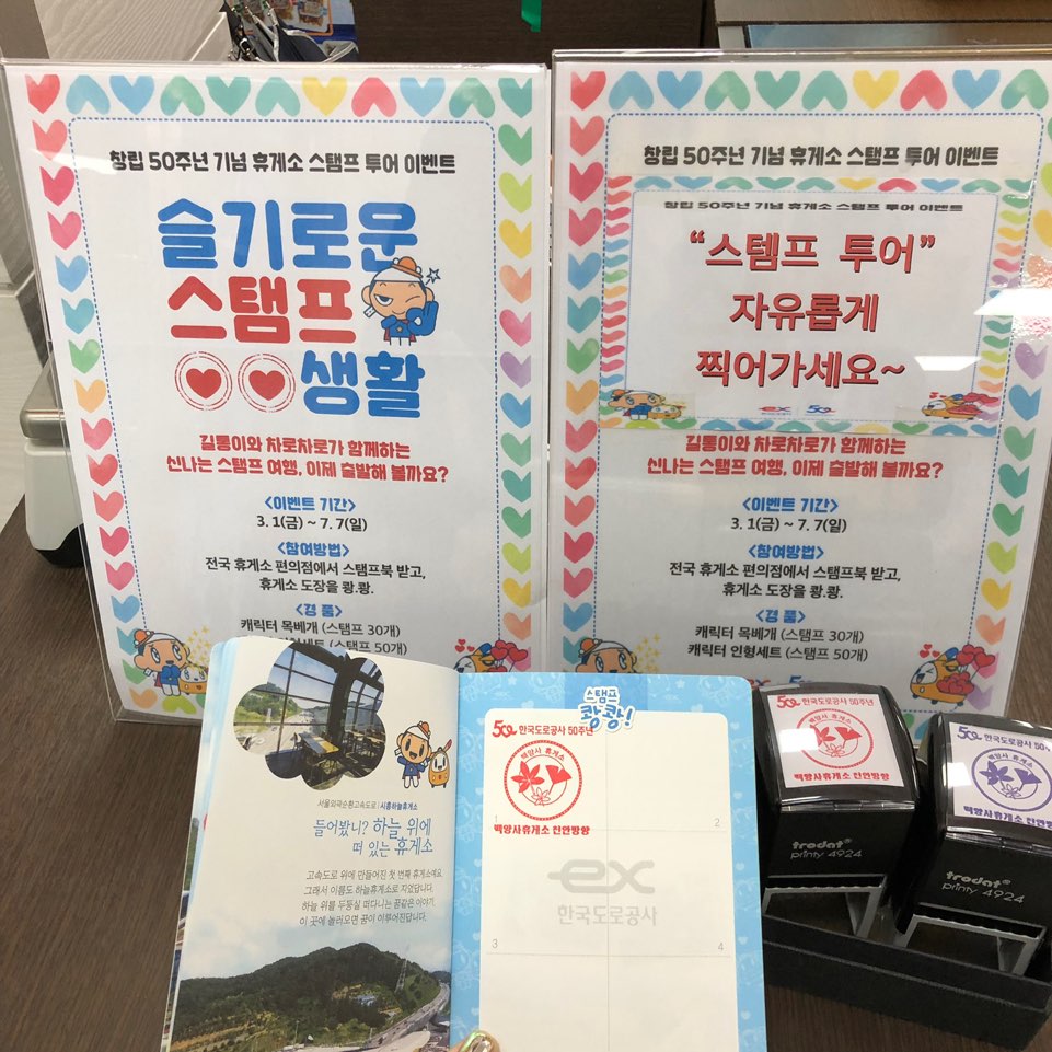 고속도로를 많이 이용하시는 분들께 드리는 행사입니다 한국도로공사 창립 50주년 기념 휴게소 스탬프 투어 이벤트가 진행됩니다 스템프투어 라고 이름 짓고 휴게소마다 휴게소스탬프를 두어서 찍는 겁니다 ㅎ 이벤트 기간은 3.1~7.7일 까지니 열심히 달려다녀야겠네요 ㅎ 전국 휴게소에서 스탬프북을 받고 도장을 찍으면 됩니다 ㅎ 경품으로는 !! 캐릭터목베개 (스템프 30개) 개릭터 인형세트(스탬프 50개) 가 되겠습니다 ㅎ ![]() 모두 고속도로로 gogo 하시죠 ㅎ 모든 행복과 불행은 오로지 우리가 애정을 느끼는 사물의 질로부터 비롯된다. |